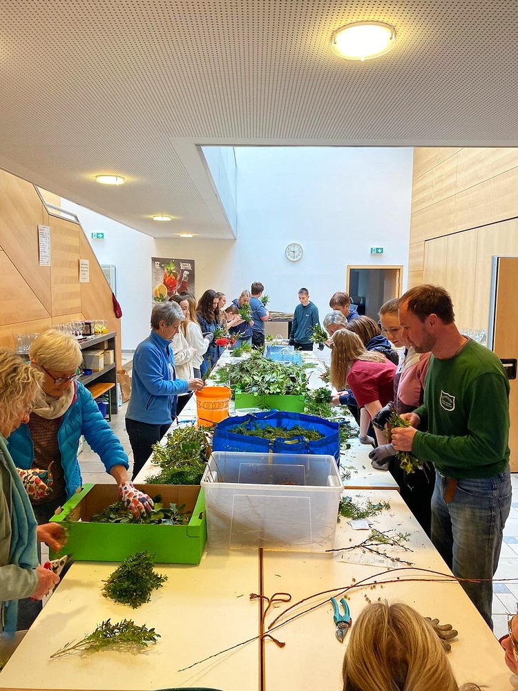 Unter größter Motivation wurde vier Stunden lang gebunden, wobei ca. 230 Palmbuschen das Ergebnis waren.